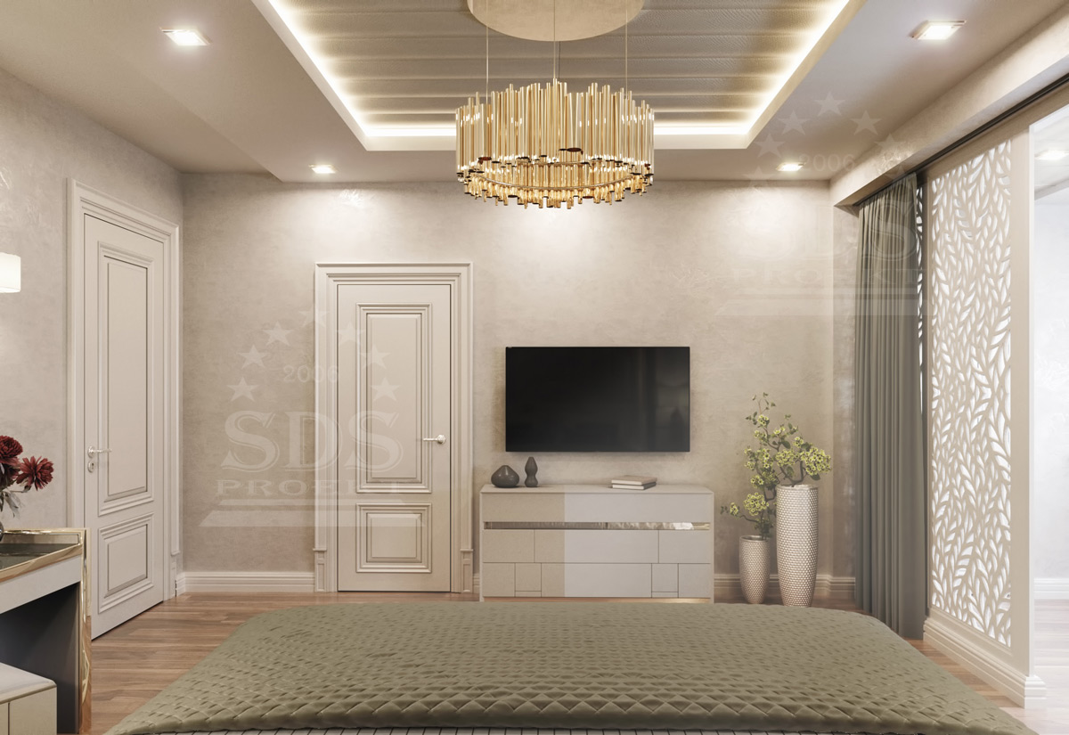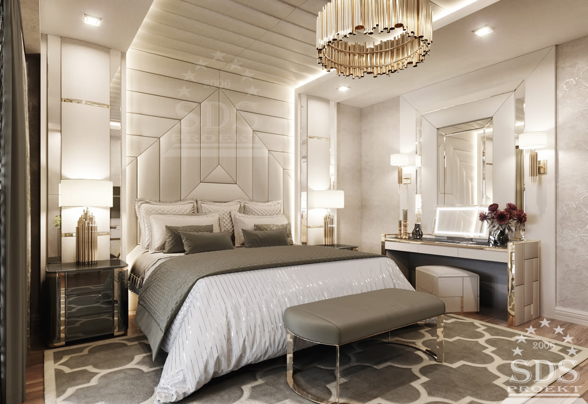 Отделка комнаты использует светлые нарядные оттенки (бежевые, серые, жемчужные). В богатом интерьере спальни доминирует, конечно, шикарная двуспальная кровать с мягким атласным изголовьем и резным обрамлением. Текстильное убранство аккумулирует цветовую палитру комнаты в более насыщенных тонах, дневные и ночные шторы сияют перламутром.